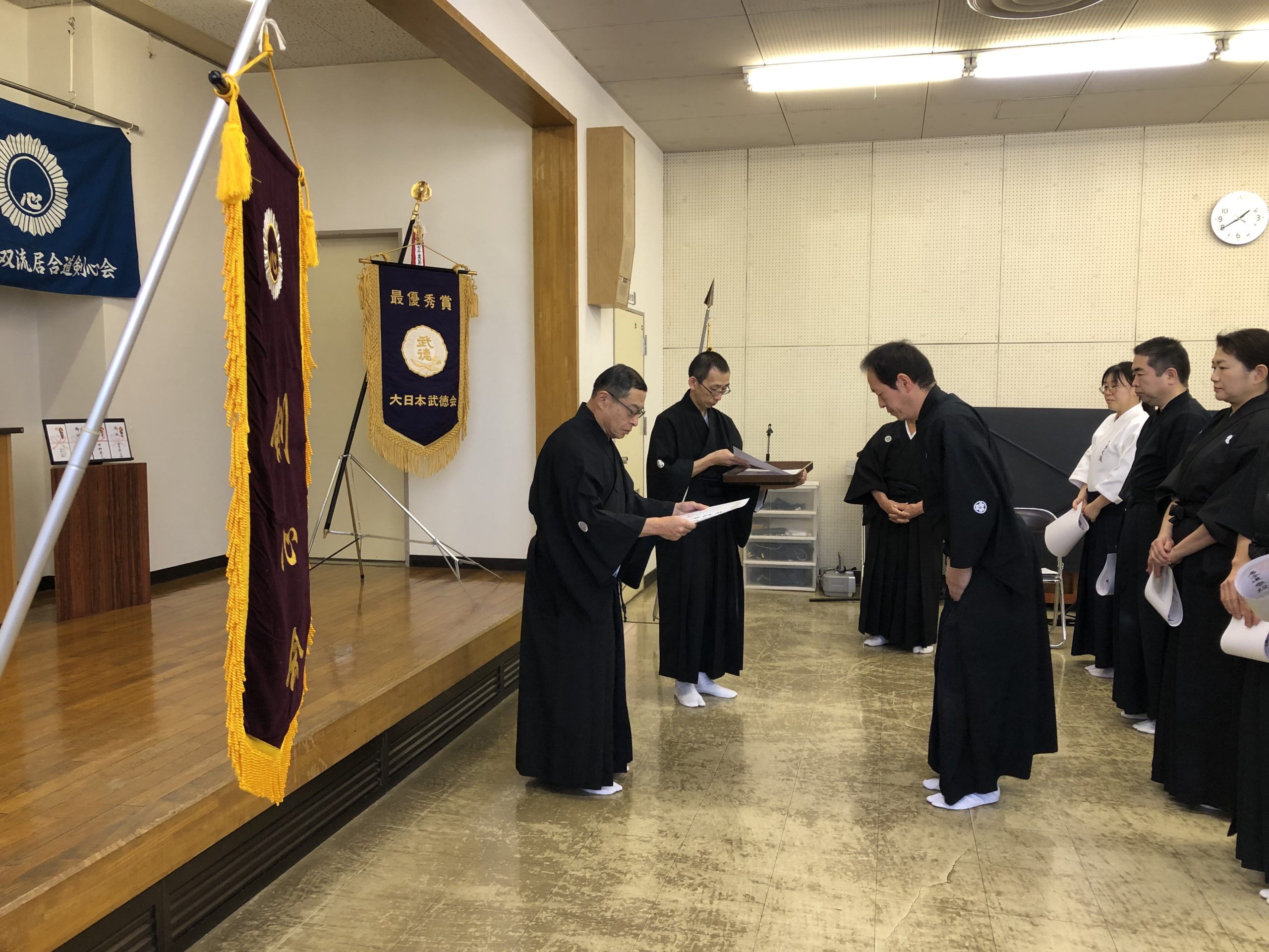 さらに、2名に師範の允許状が授与され、1名に筆頭師範代の允許状が授与されました。師範はしばらく空席であったことから、今回の允許により、新たな時代の中で、一心無双流の継承とさらなる発展を図るための体制強化がなされました。